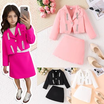 Primavera autunno Set di abbigliamento da ragazza alla moda giacca a maniche lunghe con risvolto gonna corta Set due pezzi abbigliamento per bambini Set di vestiti per ragazze